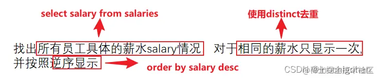 找出所有员工具体的薪水salary情况,对于相同的薪水只显示一次,并按照逆序显示,以上例子输出如下: