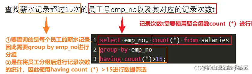 查找薪水记录超过15次的员工号emp_no以及其对应的记录次数t,以上例子输出如下: