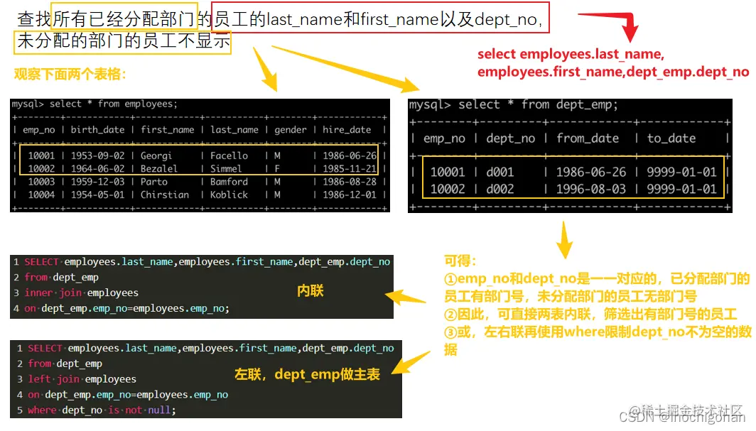 查找所有已经分配部门的员工的last_name和first_name以及dept_no,未分配的部门的员工不显示,以上例子如下: