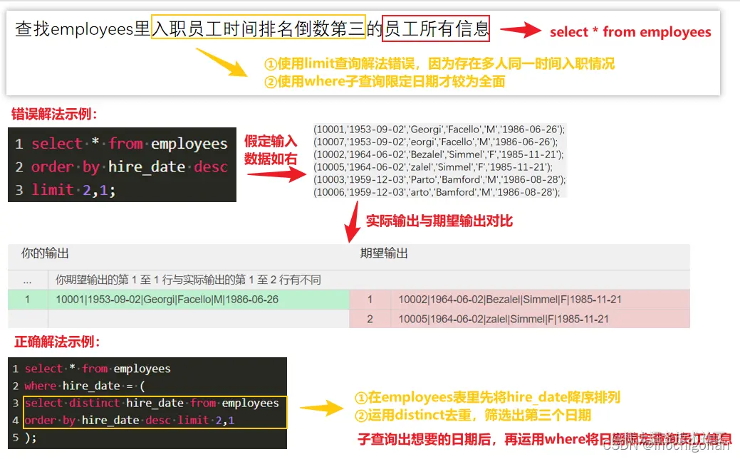 - 题目二相比于题目一,允许存在同一个日期入职的员工,导致limit不适用,这也是limit局限的地方