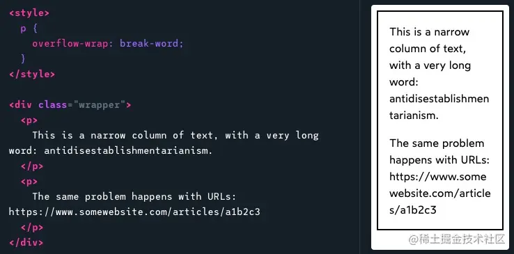 通过设置overflow-wrap: break-word可以让文本在没有空间时将一个单词截断进行强制换行,虽然少了”优雅“换行的机制,但是至少我们能优先避免文本溢出的布局混乱这个更加影响用户体验的问题。