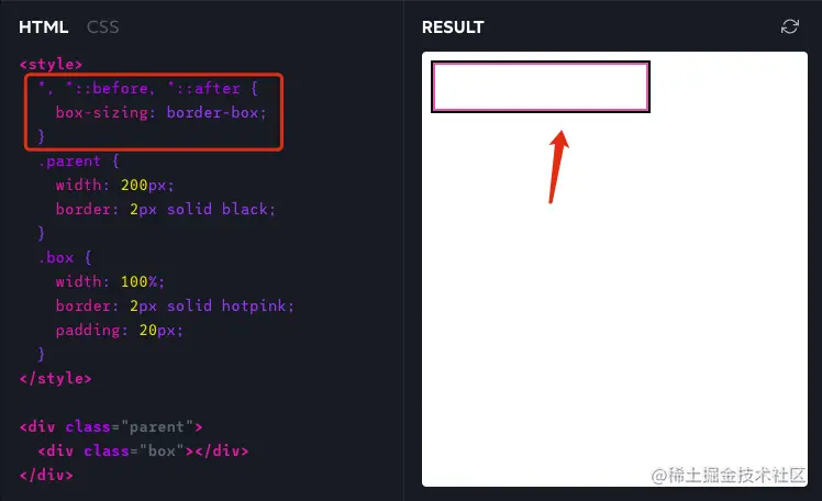 但由于浏览器的默认是:box-sizing: content-box,即设定元素的宽度是不包括padding和border的,导致box的宽度是200px + 2px * 2 + 20px * 2 = 244px,超出parent很多,这个行为其实很违反常理,如果继续使用content-box这个模型,开发者在定义宽度时需要进行很精细的计算,稍有不慎就会导致布局混乱。