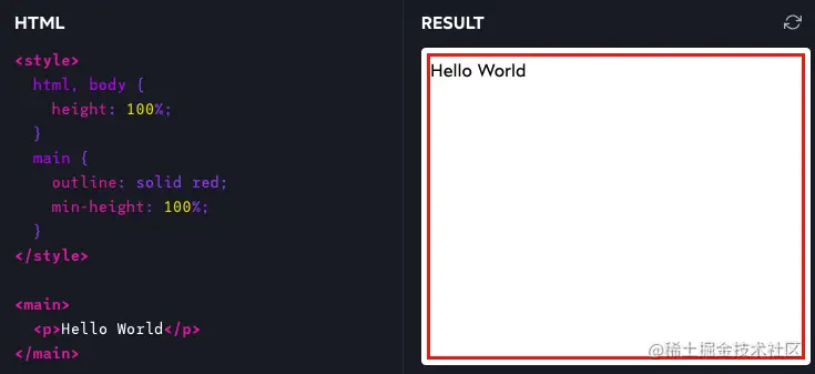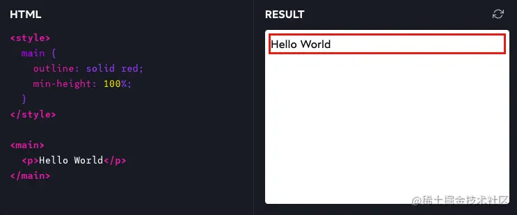 如下图,通过将html、body的height设置为100%后可以看到main能够如预期一样生效。