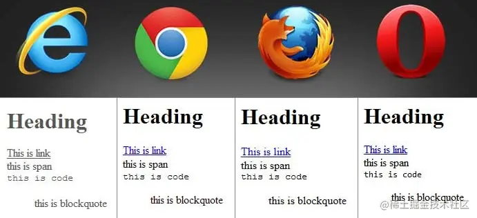 各个浏览器将自认为合适的“边框”,“填充”,“边距”,“字体”,“行高”等样式加载到一些基础元素(input,div,a,span)中,以赋予页面独特的感觉。