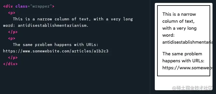 在默认情况下,换行算法会试图使用”优雅“的换行方式,比如遇到”空格“或者”连字符“;但是如果一段超长的文本中没有这些字符,就不会触发默认的自动换行算法,进而导致溢出的布局混乱,如图: