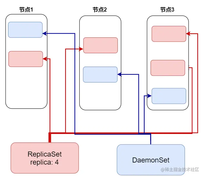 图中,我们可以看出 DaemonSet 是每个节点分别部署一个 pod ,但是ReplicaSet 只是保证整个集群中自己管理对应标签的 pod 数量是 4 个即可