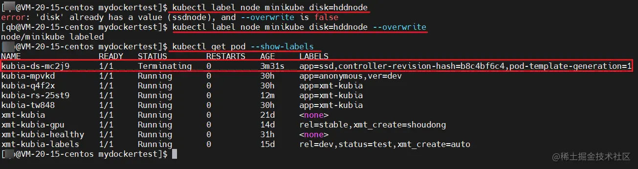 我们再次修改 node 标签,那么之前的 pod 是不是会被终止掉呢?我们来试试吧