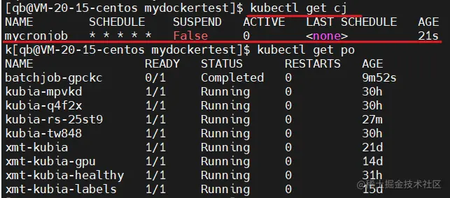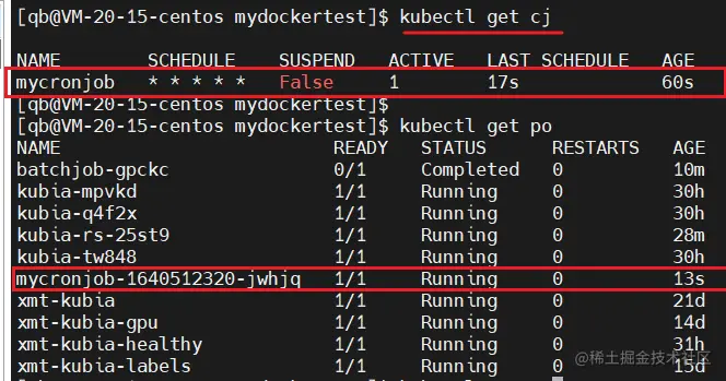 再次查看我们的 cj ,我们可以看到 ACTIVE 已经是 1 了,说明已经通过 cj 创建了 1 个 pod
