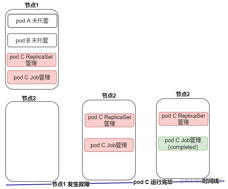 上图中我们可以看到,被 ReplicaSet 和 Job 资源管理的 pod,当节点发生异常或者 pod 自身发生异常的时候,这些 pod 是会被重启的,不需要人为的去操作