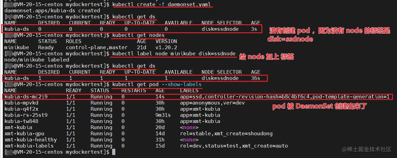 果然没毛病老铁,当我们修改环境中指定节点的标签后,由于 DaemonSet 资源搜索环境中没有自己配置中指定的标签对应的节点,因此,刚才的 pod 就会被销毁掉
