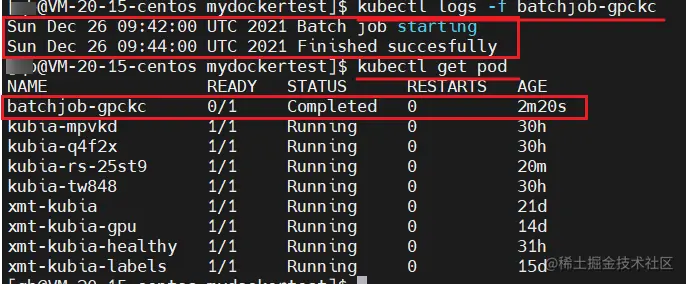等到 pod 运行 2 分钟左右的时候,我们可以继续查看日,程序已经成功结束了,且我们的 pod 也进行了 Completed 状态 ,该 Job 也结束了