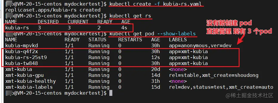 对于原本就有的 3 个标签为 app=xmt-kubia 的 pod 没有影响, rs 也没有多创建 pod ,这没毛病