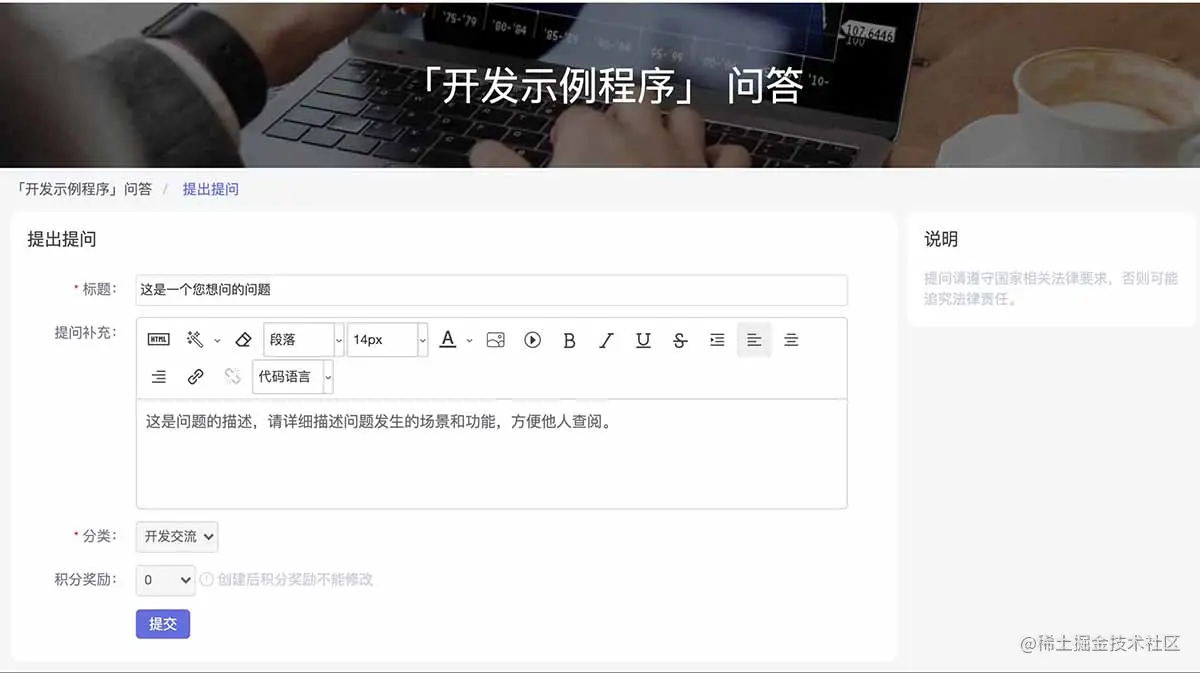 在模块页面的问答,点击提出问题,填写问题标题和提问补充,设置分类,即可完成问答的提交。
