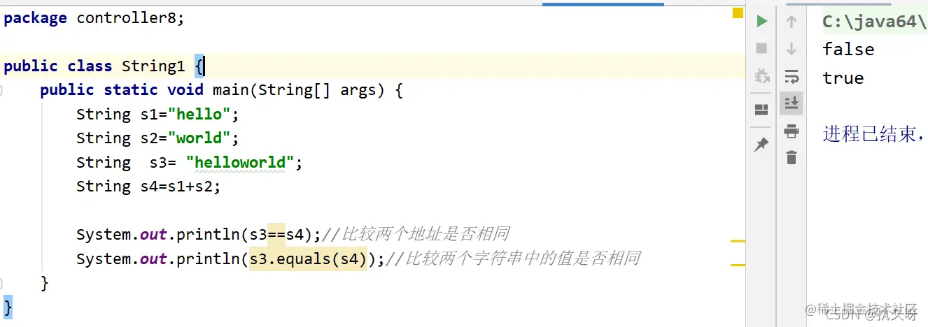 System.out.println(s3==s4);//比较两个字符串的地址是否相同