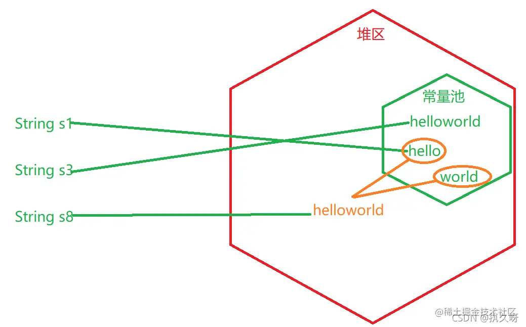 解释同上,重新简单的说一下,s3在先在常量池中创建helloworld,s8是由变量s1和常量