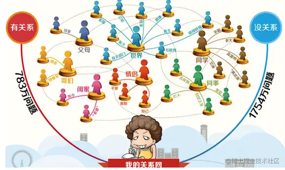 - 微信朋友圈:对于微信这种社交产品而言,用户与用户之间编织成一张错中复杂的关系网,用户彼此之间,可能是一度人脉,也可能是二度人脉,也可能是同事关系,也可能是亲友关系,建立联系的时间和方式也是个不相同,而且还有用户之间的权限设置,比如一个人你不想让他看你的朋友圈,可以设置权限等,整个关系网纵横交错,端的是十分复杂。