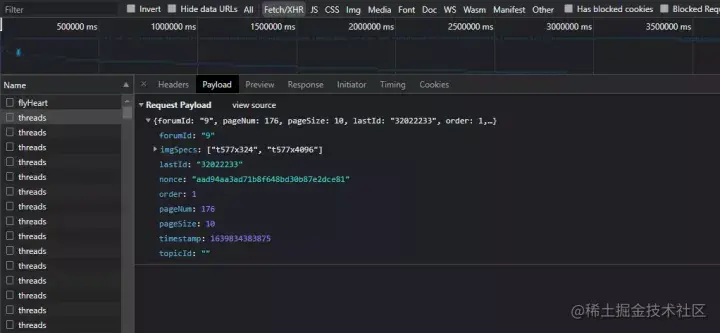 这是抓包后的情况,通过对多个包进行比较发现,实际变化的参数只有lastId、nonce、timestamp、pageNum。具体分析了一下,lastId:前一页最后一个发言用户的tid;pageNum:当前页码;timestamp:13位时间戳;nonce:不知道是什么,但是看他长了一副加密的脸。至此,目标就很清晰了,重点针对nonce。