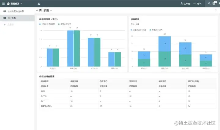统计页面内有不同维度的数据统计图,可供业务负责人去查看数据排查的进度情况,