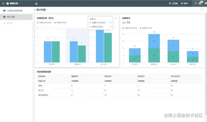 其中有柱状图、透视图按支行类型、权限人员等维度去统计排查的情况。