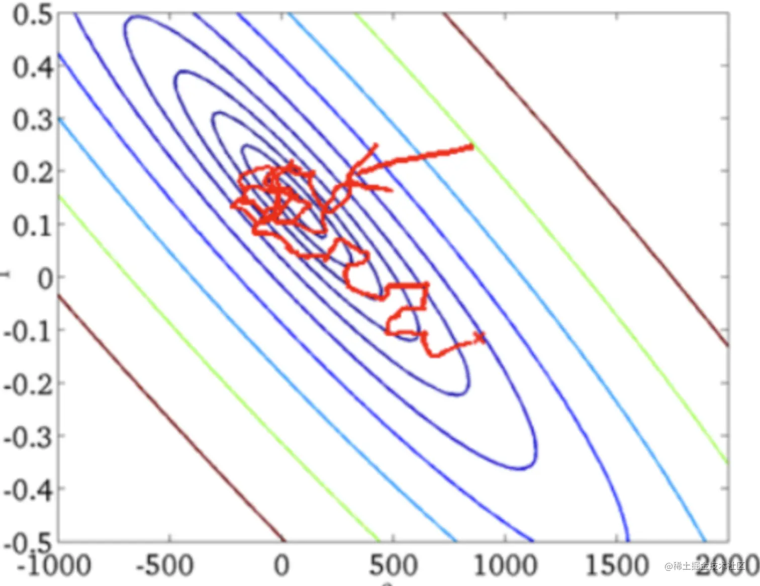 随机梯度下降是通过每个样本来迭代更新参数一次,对比 BGD 的迭代一次需要用到所有训练样本(往往如今真实问题训练数据都是非常巨大)多次数据集全局迭代。SGD 每次迭代的计算与存储要求都非常的少,每轮迭代次数非常快,但是,SGD 伴随的一个问题是噪音较 BGD 要多,使得 SGD 并不是每次迭代都向着整体最优化方向,所以出现模型的反复震荡。