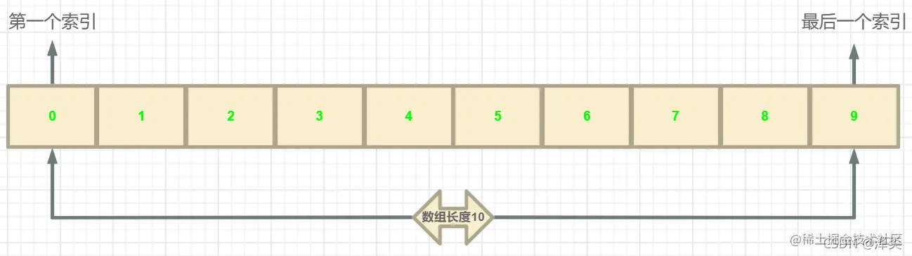 在数组 arr[10] 中只能使用 [0~9],不能访问 arr[10],若使用就会出现下标越界错误!