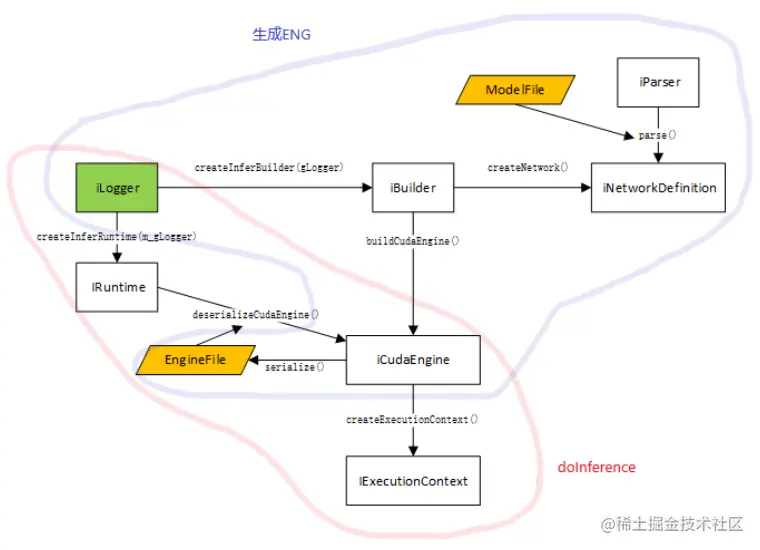 Network Definition 是用于解析模型之后在 tensorrt 中的网络定义,Builder 主要作用是把 Network Definition 按照对应的硬件生成相应的可执行程序,也就是 Engine。如果你进行在线推理的话,其实直接接着进 runtime 就好了。而实际中,我们往往需要把这个 Engine 保存成一个离线模型 .eng,以便于 runtime 过程的解耦,因为 runtime 往往在用户现场,而 runtime 之前的操作往往在家里。这个时候就需要用到 serialize 和 deserialize 了。