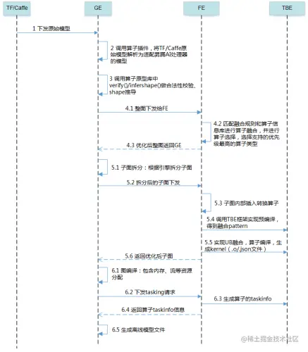 GE 是图引擎,FE 是融合引擎,TBE 是张量加速引擎。GE 主要作用是解析前端框架、链接后端、调度排布的融合引擎;FE 主要作用是实现算子融合、UB 融合;TBE 主要作用是提供了算子在华为加速卡中的实现编译、任务执行。结合上图,整个流程分成这么几个阶段:2~4 为算子适配替换、5 为子图拆分优化、6 为调度与流程排布。不难看出,经过 6.1 阶段后,实际推理过程中已经不存在所谓的网络层的概念,此时是由一个个 taskinfo 组成了离线模型 .om 文件,最终的 Runtime 时是通过调用 .om 内的信息进行任务下发。