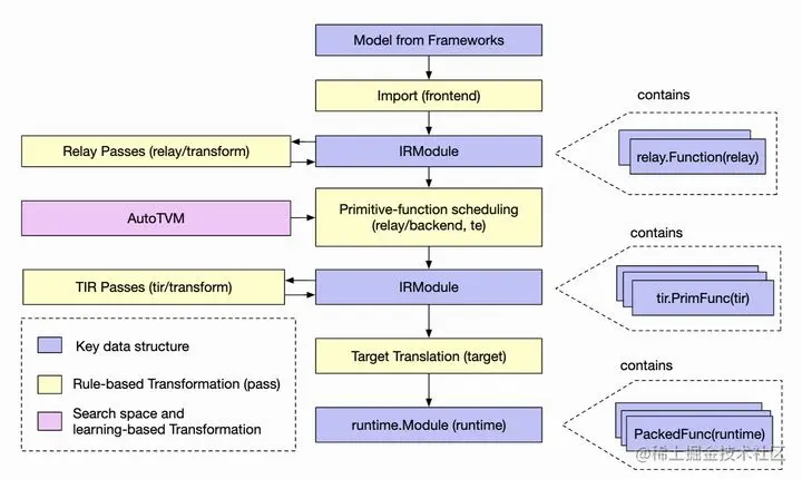 整个 TVM 的编译流逻辑如下[图片参考自]: