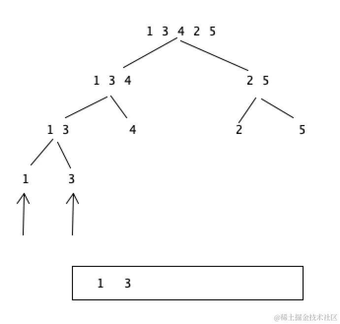 此时左侧的1,3和右侧的4分别已经排好序了 然后在一起merge