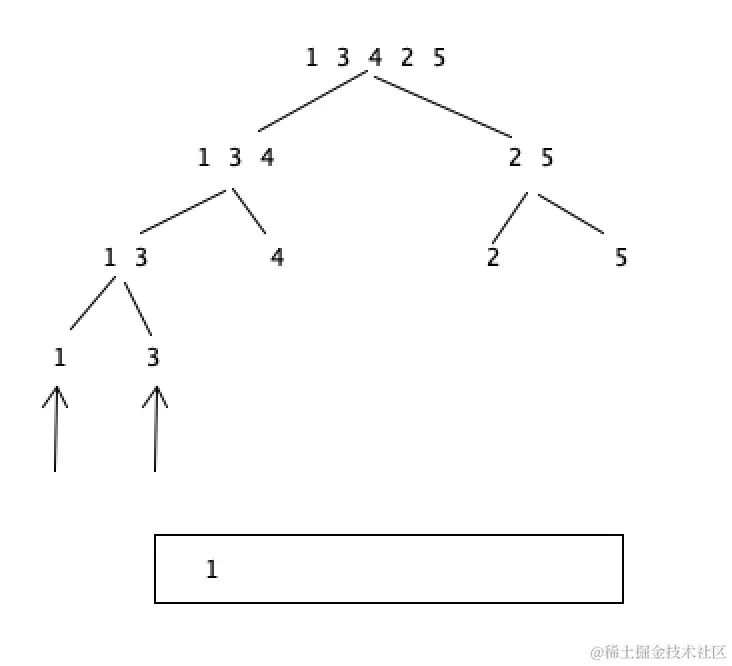 此时1,3,4和2,5要merge