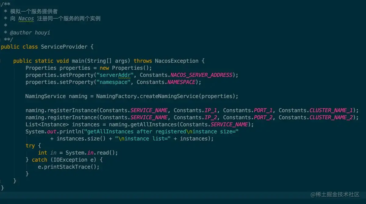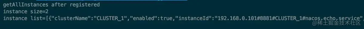 通过 NamingService 接口的 registerInstance 方法就可以将服务进行注册了,该方法有很多重载的方法,这里我们选择一个简单的来调用就好了。注册完成后,通过调用 getAllInstances 方法,立即获取所有可用的实例,然后让主线程等待,打印如下: