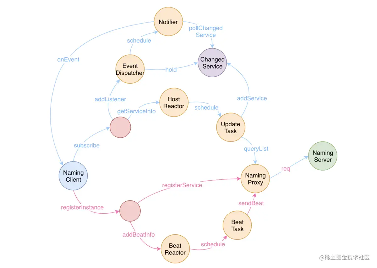 Nacos客户端进行服务订阅时也有两部分组成,一个是不断从服务端查询可用服务实例的定时任务,另一个是不断从已变服务队列中取出服务并通知 EventListener 持有者的定时任务,更新服务订阅列表。