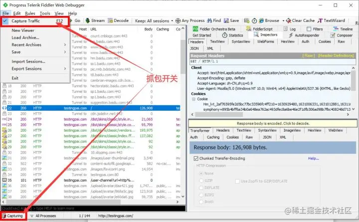 Fiddler 有一个抓包开关,File –> Capture Traffic,开启后左下角显示,也可以直接点击左下角图标来关闭/开启抓包功能。