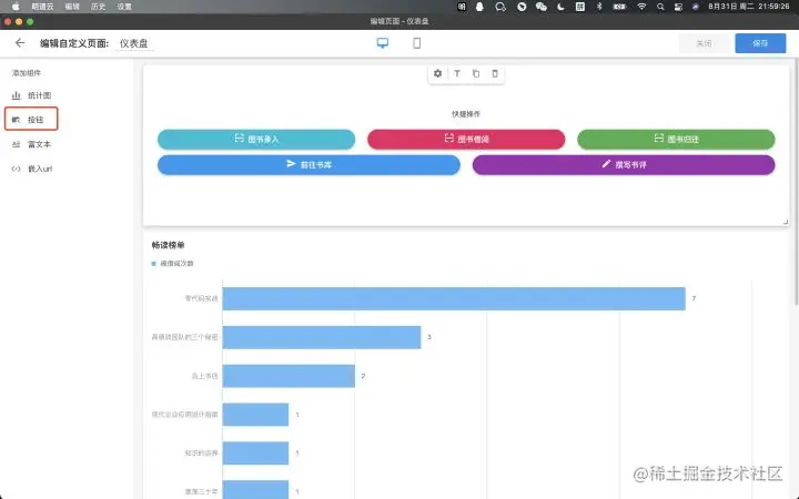 当然,也可以给自定义页面配些统计图。例如统计借阅数量前10的图书、借阅次数前10的借阅达人、写书评前10的书评达人等。