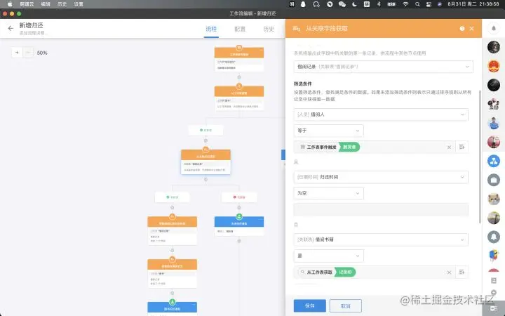 - 有数据的情况下,则添加获取单条数据节点,选择获取【图书】关联记录【借阅记录】中,借阅人=触发者且归还时间为空且借阅的图书=上面节点获取的图书。