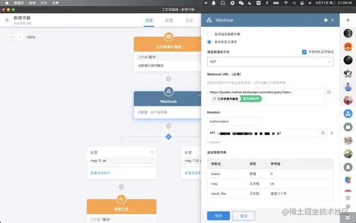 - 添加webhook节点,以发送请求get的方式,向图书资源库查找ISBN号的书籍信息。