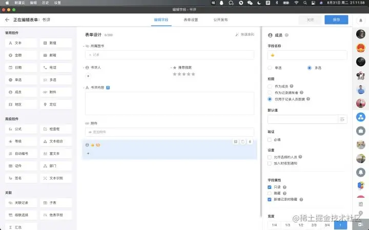 书评表,相对而言就简单了一些。添加与图书的双向关联关系,书评人默认为创建者,书评推荐和书评内容必填。添加多选成员字段作为点赞成员列表,设置为记录人员数据和新增时隐藏即可。
