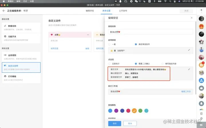 在工作表【书评】内添加自定义动作:点赞,设置启用筛选条件:当成员字段点赞不是当前用户,立即执行。