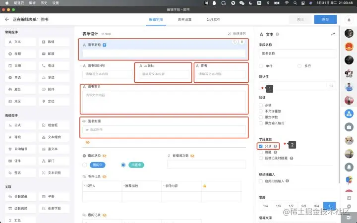 而图书名称、出版社、作者、图书简介、图书封面的字段配置,可以考虑直接设置为 只读,毕竟我们是计划直接用工作流来更新这些信息的。