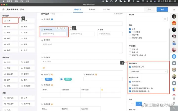 图书表的配置重点在于,添加文本框为ISBN号,输入形式可以设定为:移动端输入
