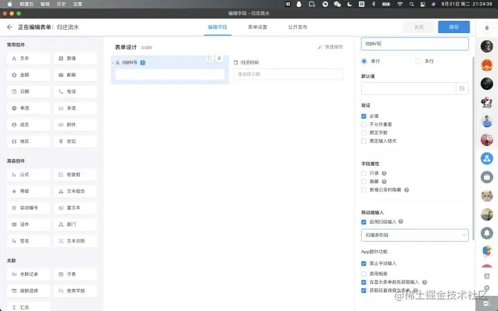 其次是【借出流水】,考虑到要一键扫码借出,所以借出流水只需要配置ISBN号和借出时间即可。其中ISBN号的设置与【图书】类似,借出时间可以设置默认为创建时间,也为只读。