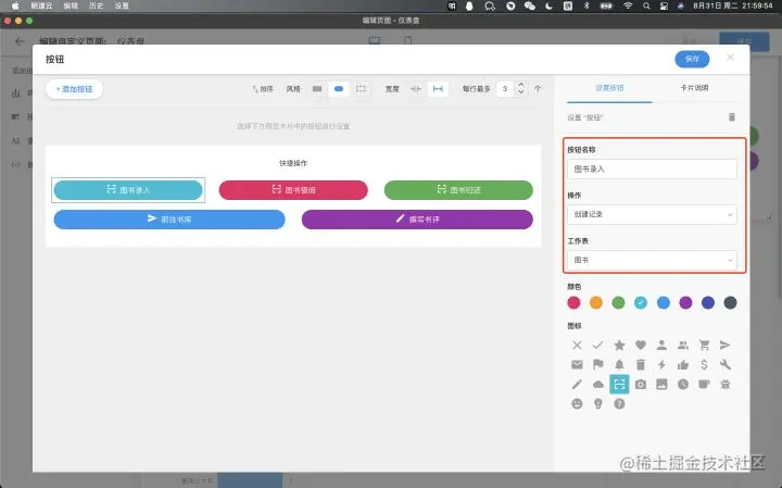 添加图书录入、图书借阅、图书归还按钮,分别对应【图书】【借出流水】【归还流水】的创建记录。除此之外,还可以添加前往书库、撰写书评等快捷操作按钮,对应打开视图或创建记录等操作。