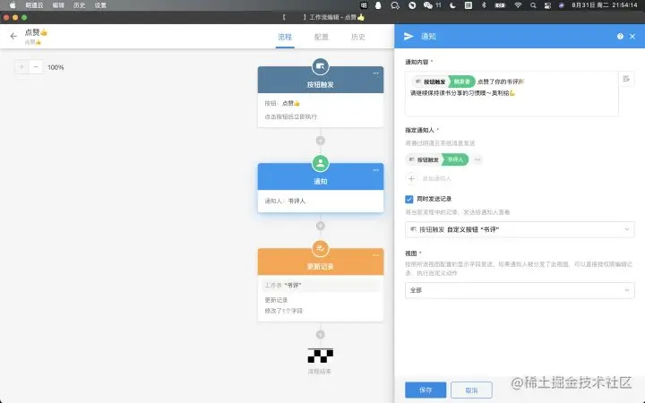 同时配置工作流,通知书评人被点赞的好消息。