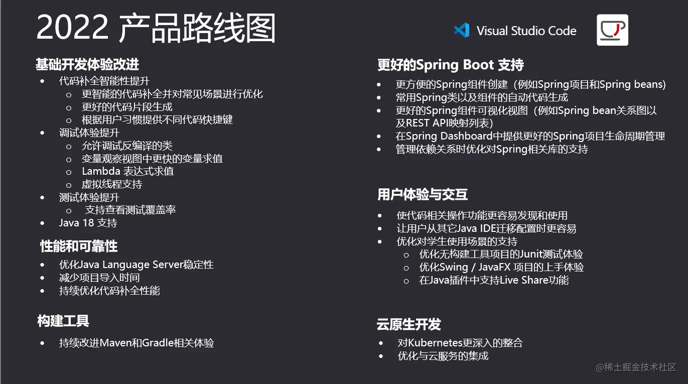 性能和可靠性是我们 2022 年关注的另一个领域。在这方面,我们希望提高 Java Language Server 的可靠性,减少 Java Language Server 无响应的情况。我们还从用户反馈了解到,如果有很多依赖项要下载,那么第一次导入项目可能会花费很多时间,因此我们也计划对此进行研究。最后但同样重要的是,我们将继续优化代码补全性能。