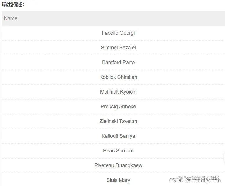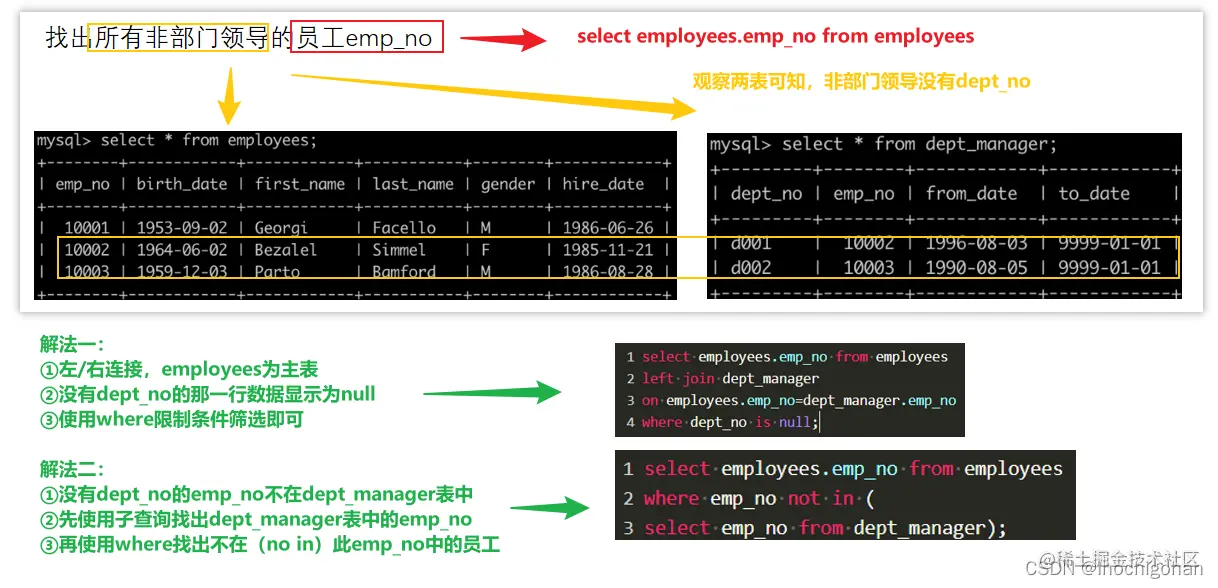 找出所有非部门领导的员工emp_no,以上例子输出: