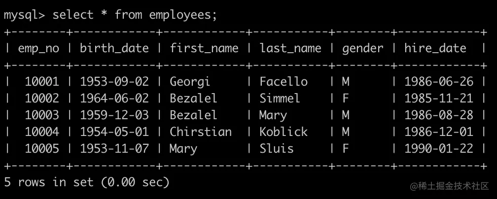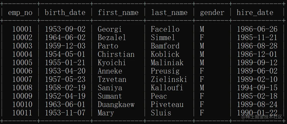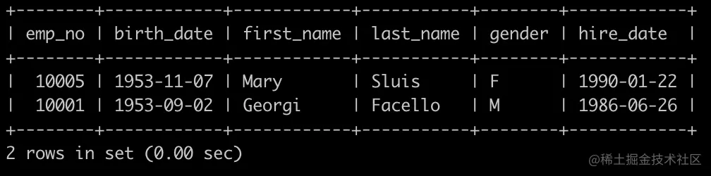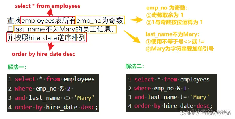 查找employees表所有emp_no为奇数,且last_name不为Mary的员工信息,并按照hire_date逆序排列,以上例子查询结果如下: