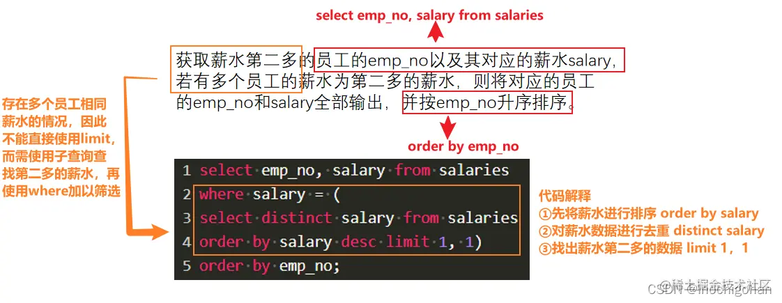 获取薪水第二多的员工的emp_no以及其对应的薪水salary,若有多个员工的薪水为第二多的薪水,则将对应的员工的emp_no和salary全部输出,并按emp_no升序排序。
