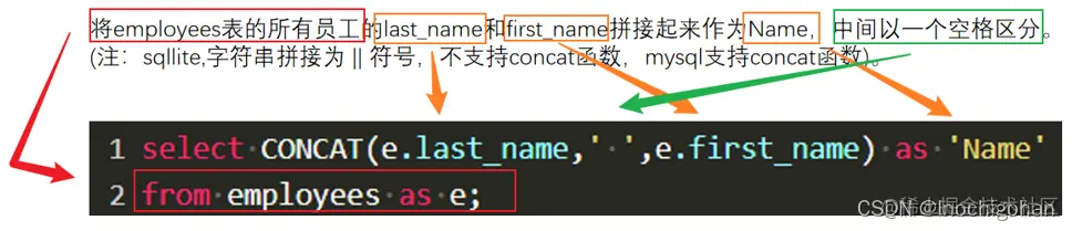 将employees表的所有员工的last_name和first_name拼接起来作为Name,中间以一个空格区分。(注:sqllite,字符串拼接为 || 符号,不支持concat函数,mysql支持concat函数)。