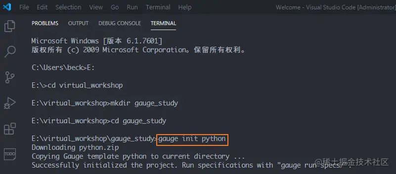 在E盘的virtual_workshop目录下,创建一个gauge_study的项目目录,切换到该目录,使用命令 gauge init python 初始化项目