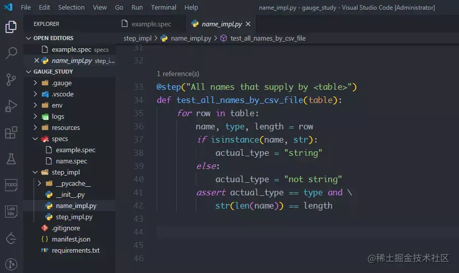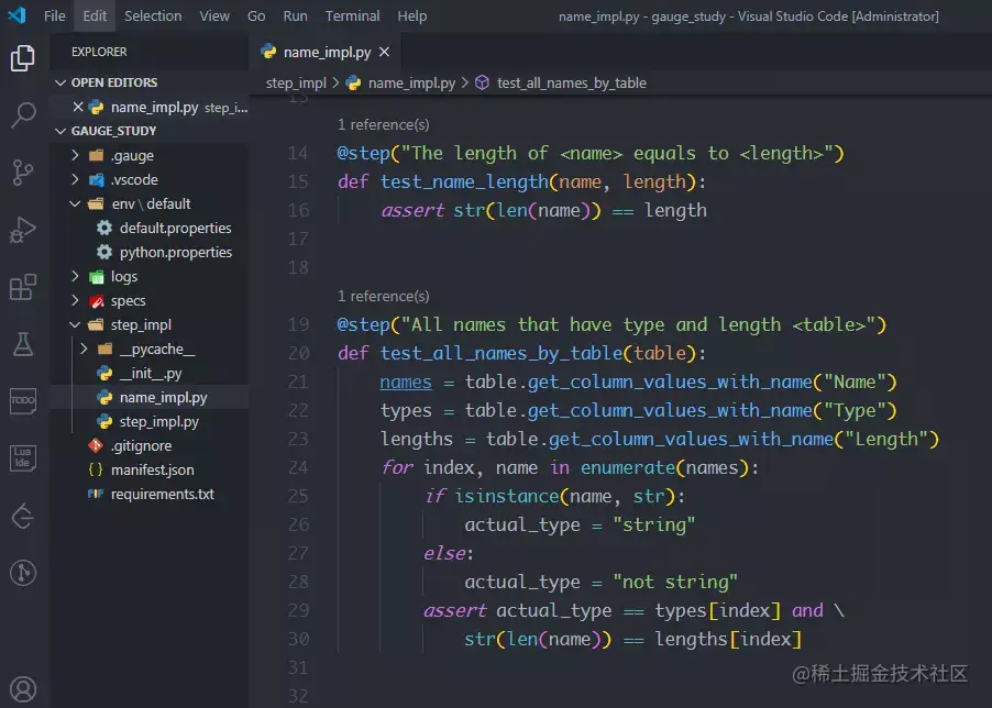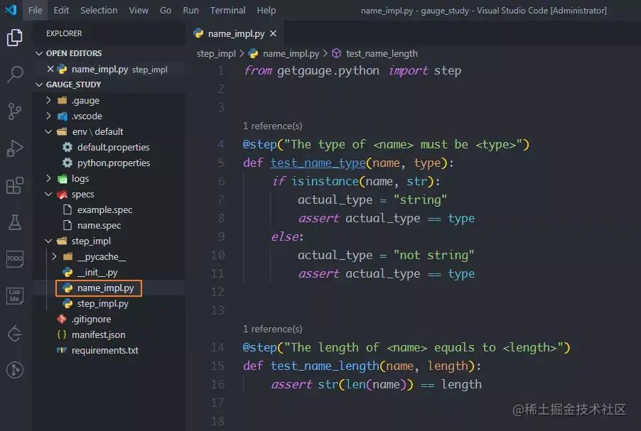 基于这一思路,在step_impl目录下创建一个name_impl.py模块,接着从getgauge.python模块中引入step方法,然后编写测试方法test_name_type和test_name_length,在测试方法上面加上 @step装饰器,装饰器里的参数是描述里的内容,只不过使用 <参数名> 做了参数化,装饰器里的参数可以传递给测试方法